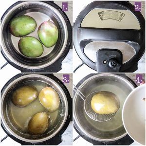 - Another way is to pressure cook the mangoes for 2-3 whistles until soft and tender. This is a quicker way to boil the raw mangoes.