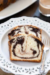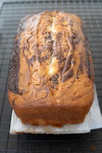 Use a butter knife or a toothpick to swirl them together gently for a marbled appearance. Tap the pan firmly on the counter. Tip — Tapping releases the steam from the cake, thus preventing it from shrinking. Bake at 350°F for 30-35 minutes, or until the toothpick inserted in the center comes out mostly clean but with a few moist crumbs.