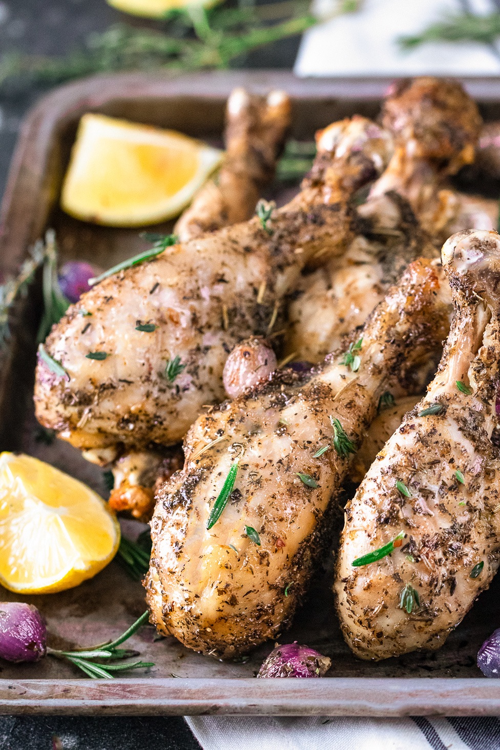 - Wash and thoroughly dry the chicken drumsticks. Remove the skin. Combine dried oregano, dried thyme, cayenne pepper, salt, garlic, garlic powder, onion powder, and dried rosemary in a separate bowl. Pour in oil and mix to combine.Pour this mixture over the chicken legs. Rub the herb marinade in every part of the chicken legs.Refrigerate the drumsticks for at least 30 minutes.TIP — All the herbs that participate in making this herb chicken delight harmonize perfectly with each other to create a gourmet masterpiece.