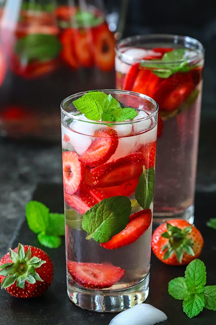 - Slice strawberries into quarters. Combine berries and fresh mint sprigs in a pitcher. Fill the pitcher with water.