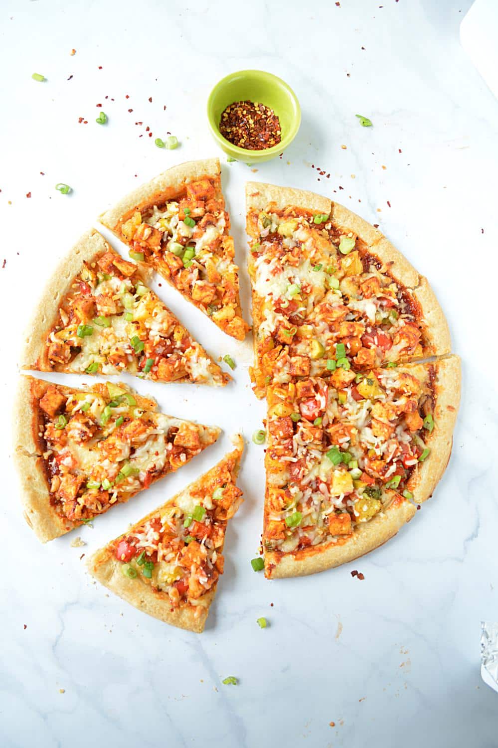 This Sweet and Spicy Tofu Pizza is inspired by our local pizza eatery. They sell THE best spicy jerk tofu pizza in town. It’s so delicious that it will delight anyone who loves tofu and pineapple combo!