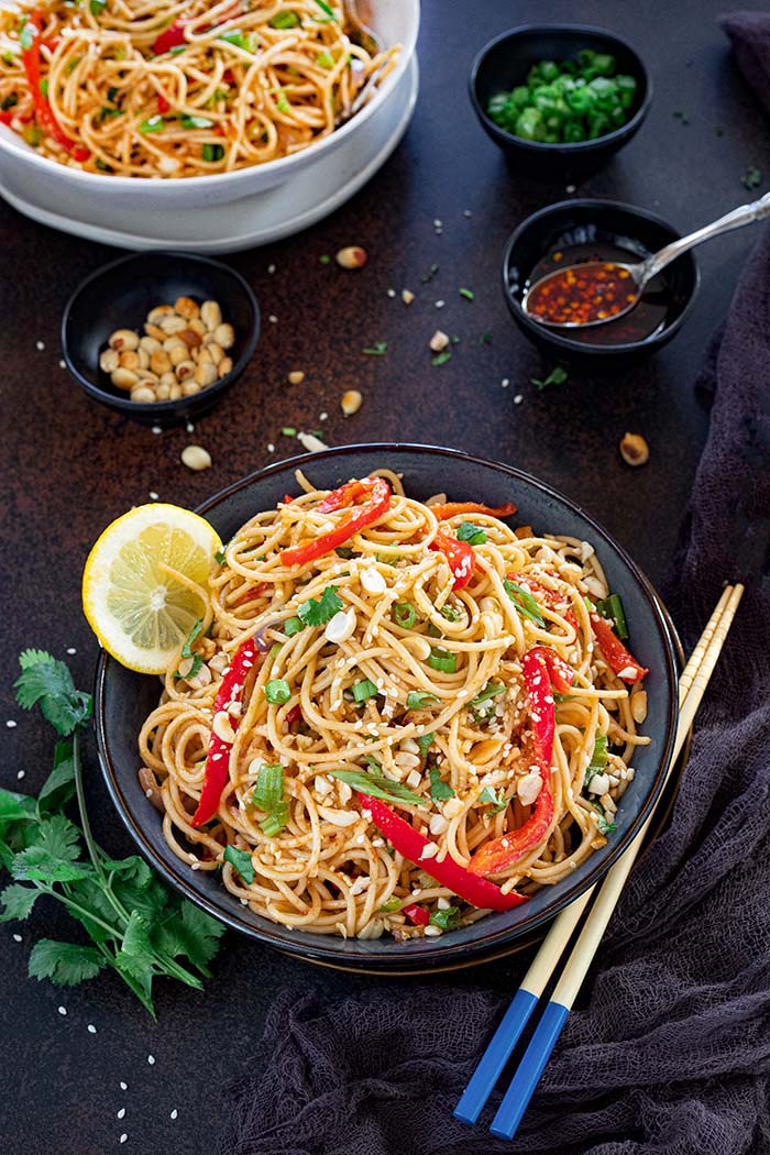 Spice level — Vegan Spicy Peanut noodles are supposed to be spicy. But since you are making it yourself, adjust the spice level to your liking. Feel free to add more or less of the chili sauce that your taste buds can handle.