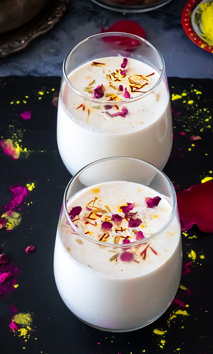 Thandai is a thick and luscious drink packed with dry nuts and flavored with fragrant spices. It’s completely