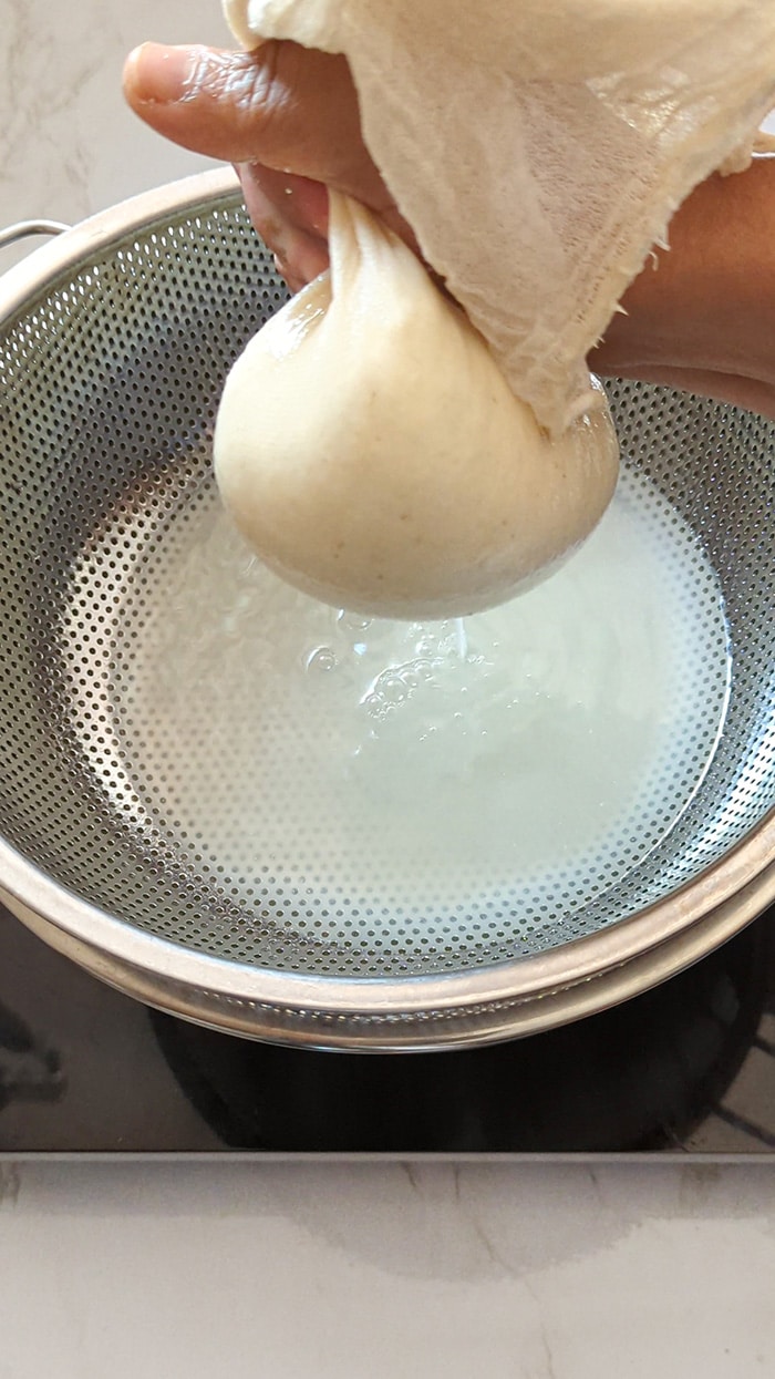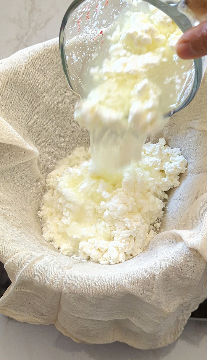 - Line a strainer with cheesecloth or muslin cloth and pour the curdled milk through it.