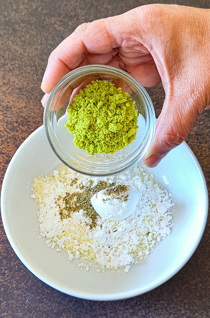 - Combine milk powder, powdered sugar, cardamom powder, and crushed pistachios in a bowl.