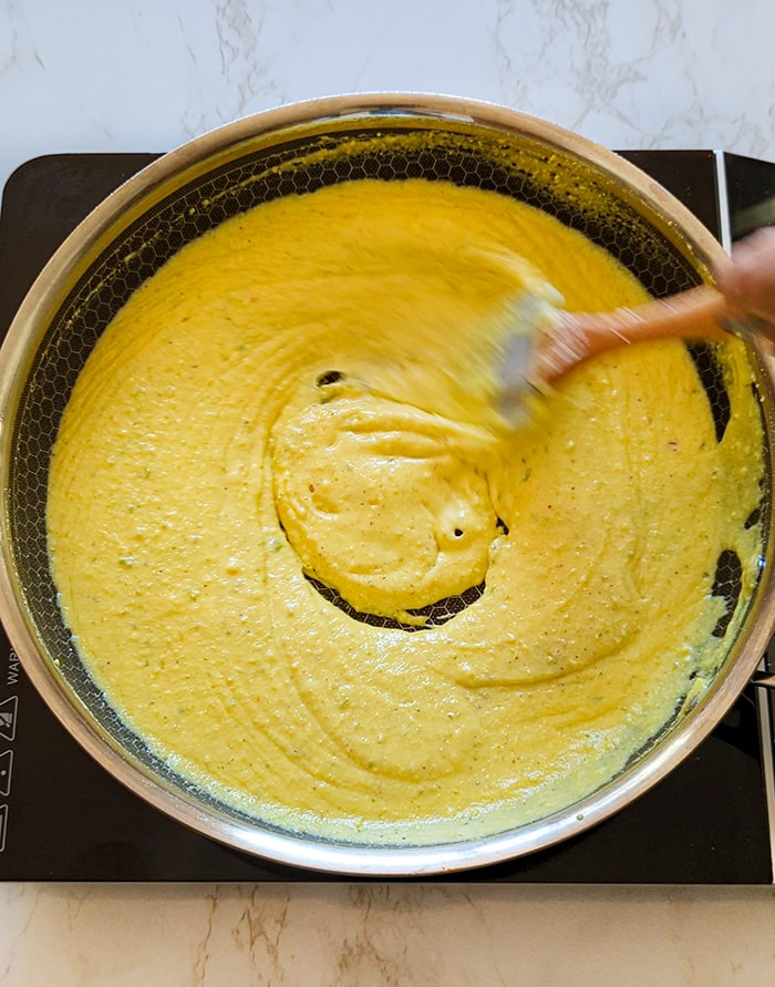 - Soon the mixture will start to thicken. Tip — Regulating heat while cooking — You need to be extra careful by maintaining the heat throughout the cooking process, as the paneer and cream mixture may stick to the base of the pan if cooked on high heat.