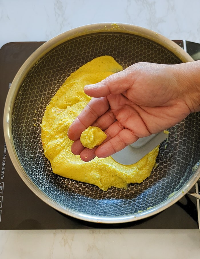 - 7-8 minutes into the cooking over medium-low heat, the mixture will start leaving the pan's sides. And when the ladoo mixture has cooked thoroughly, it comes together as a non-sticky dough in the pan. Turn off the heat.
