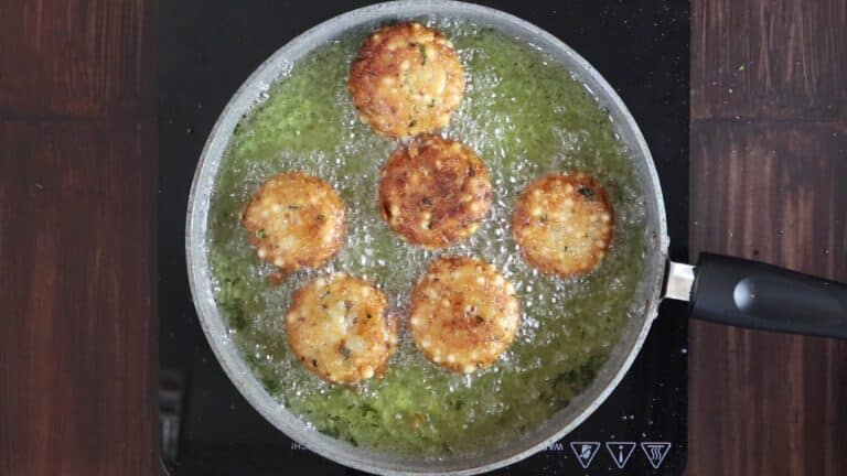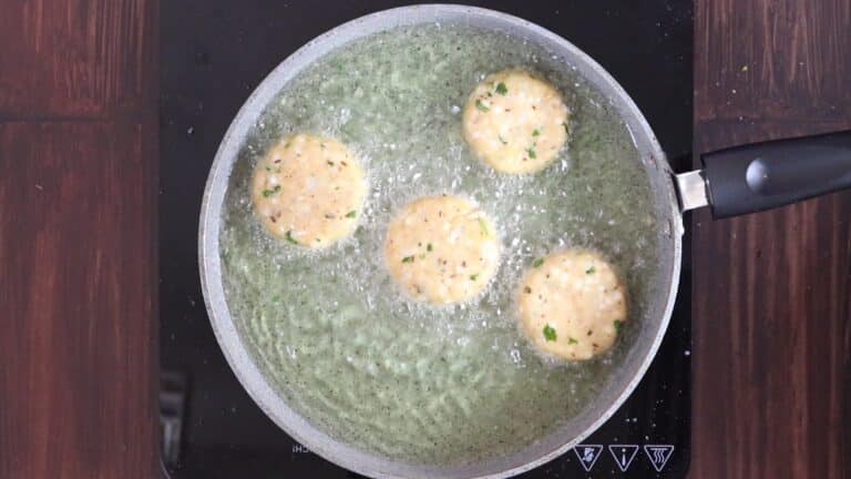 Fry in batches — Do not overcrowd the pan while frying the sabudana cutlets, as flipping will become difficult, and they may break in the process. They will also not get enough space to fry properly. Therefore, it is best to fry them in batches to give them room to get flipped easily and fry evenly.