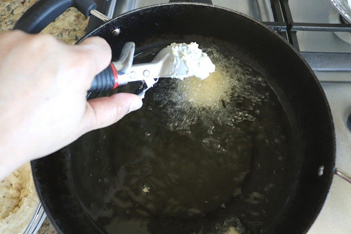 - Heat oil in a pan over medium heat. Once the oil is hot, use an ice cream scoop and drop the Bhalla batter into the oil.