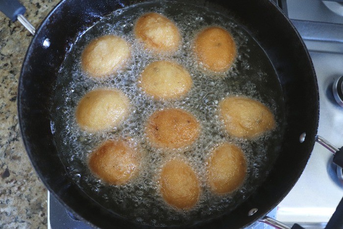 - Fry the bhallas for about 7-8 minutes over medium-high heat, turning them occasionally until they turn golden brown.