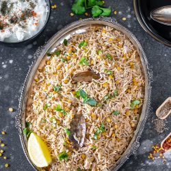 » Long grain Basmati rice – for pulao and biryanis, I always use long grain rice. This fragrant rice holds its shape well during cooking, and that’s why it is commonly used in Indian cuisine.