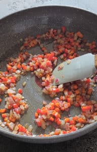 Heat oil in a pan. Reserve a tablespoon of onion and set it aside for later. Add the remaining onions and bell peppers to the hot oil.